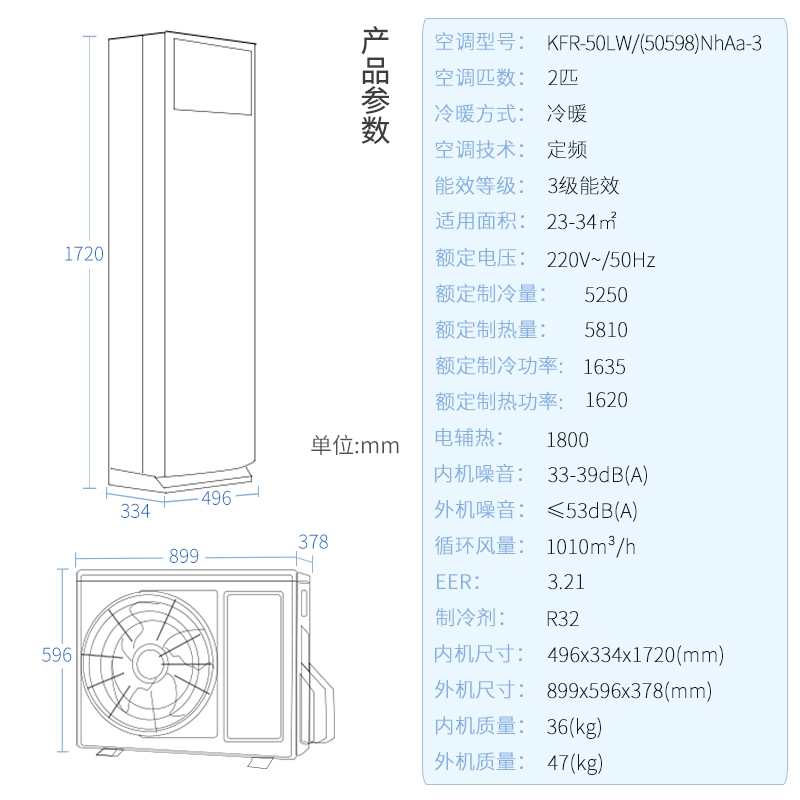 參數(shù) [空調(diào)品牌] 格力 [型號] 格力空調(diào)KFR-50LW(50598) [功率] 2匹 [售后服務(wù)] 全國聯(lián)保 [空調(diào)類型] 柜機(jī) [能效等級] 3級 [內(nèi)機(jī)尺寸] 496*334*1720mm [外機(jī)尺寸] 899*378*596 [制熱量] 5810W [制冷量] 5250W [制冷功率] 1635W [制熱功率] 1800W